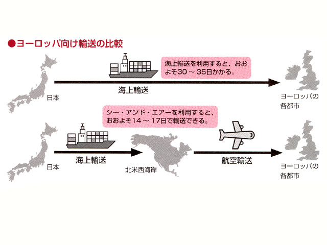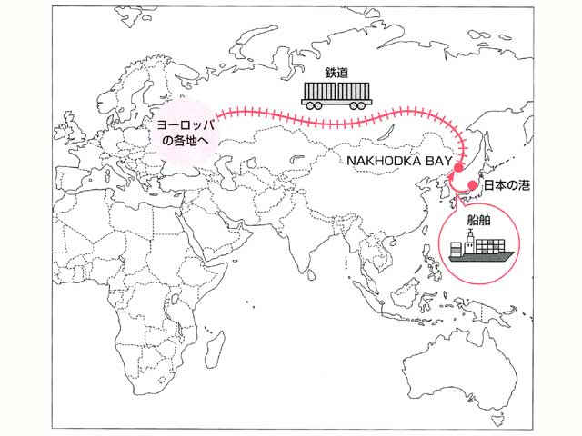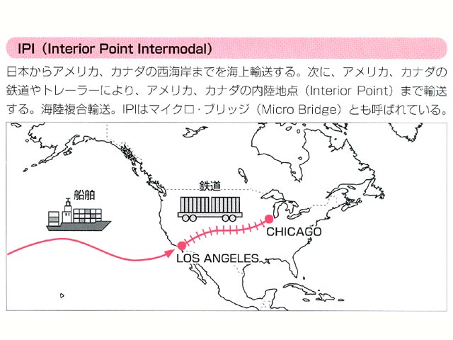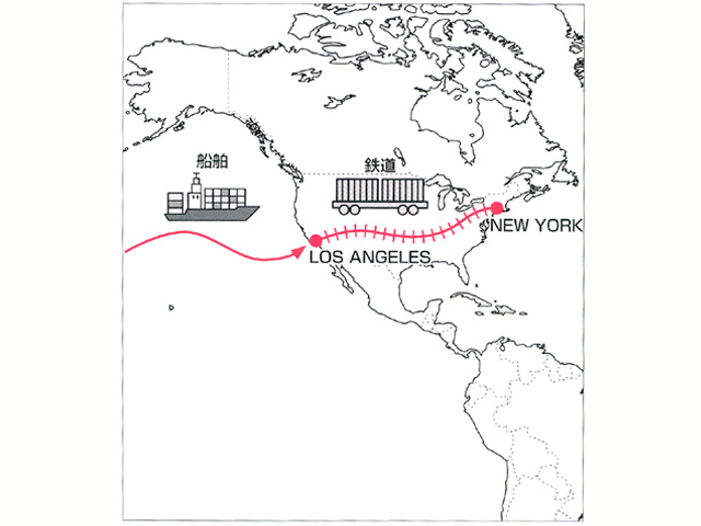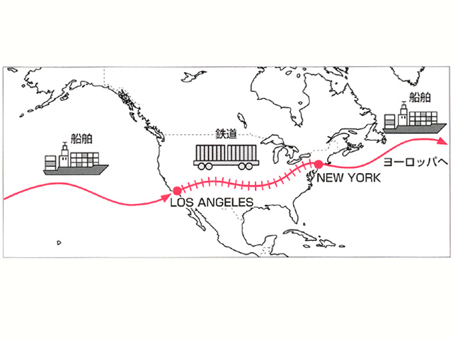 - 日本からアメリカの太平洋諸港まで船で海上輸送し、アメリカ東岸またはガルフ諸港までは鉄道輸送を