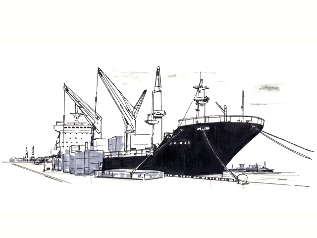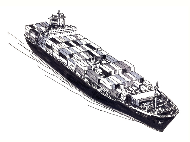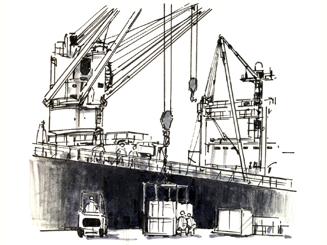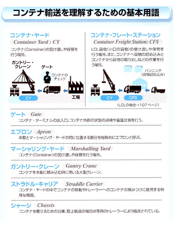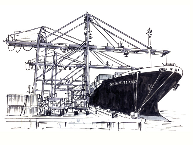 - コンテナ船の荷役形態。岸壁のエプロンに設置されたガントリー・クレーンを使用して、コンテナを本船に