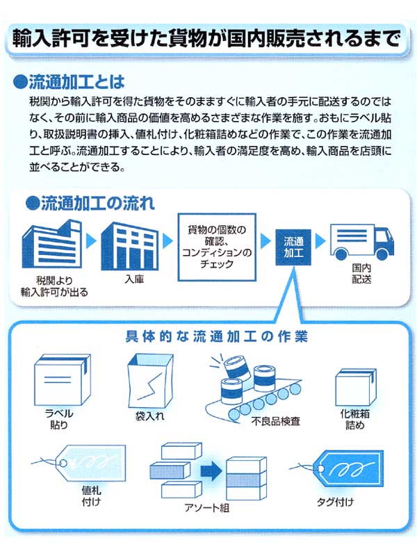 をつける加工を行います。特に輸入品の取扱いに関しては、フォワーダーが輸入通関手続きから商品の配送
