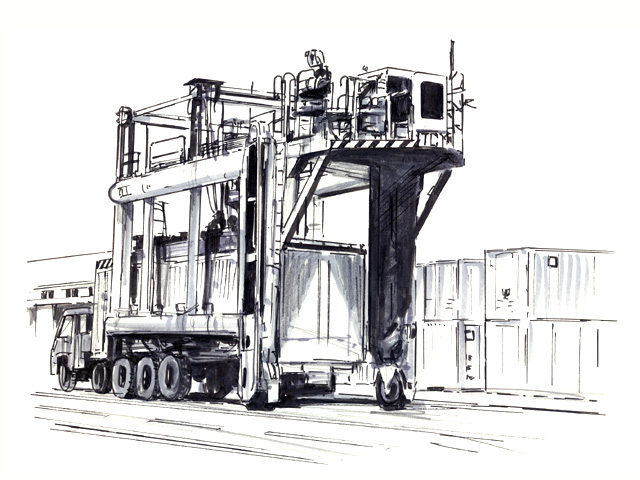 垂直に積みおろす方式。世界の主要航路の大部分のコンテナ船はこの方式です。