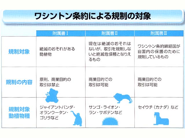 - ワシントン条約とは「絶滅のおそれのある野生動植物の種の保護を目的」としたものです。生きている