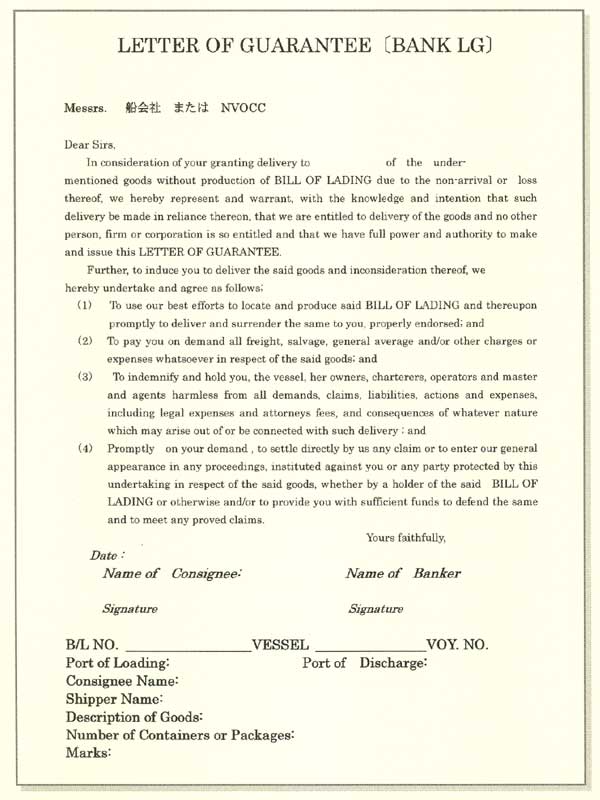 発行には保証料が発生しますので、輸入者はできるだけ早く、オリジナルの船荷証券を入手し、L/Gの
