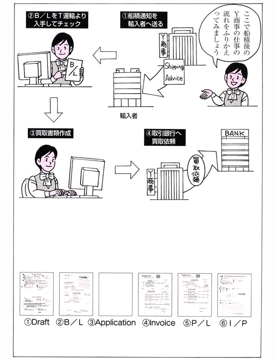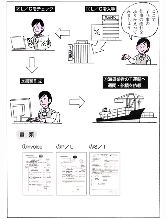 輸出の仕事の流れを理解しましょう。まずはイラストをもとに、どのような仕事が行われているのかを